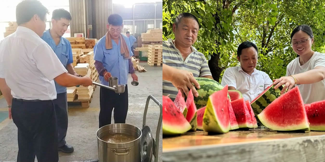 前程公司歷年來,每逢高溫都會在每個車間配備藿香正氣水、鹽汽水、冰紅茶等飲料供員工隨時自取,公司食堂也推出清爽不油膩的“夏季專屬”菜品,并每天提供綠豆粥。另外,公司行管代表也齊上陣為一線員工提供“切西瓜送清涼”的人性化服務,把清涼和關懷送到每一位一線員工的心坎上。