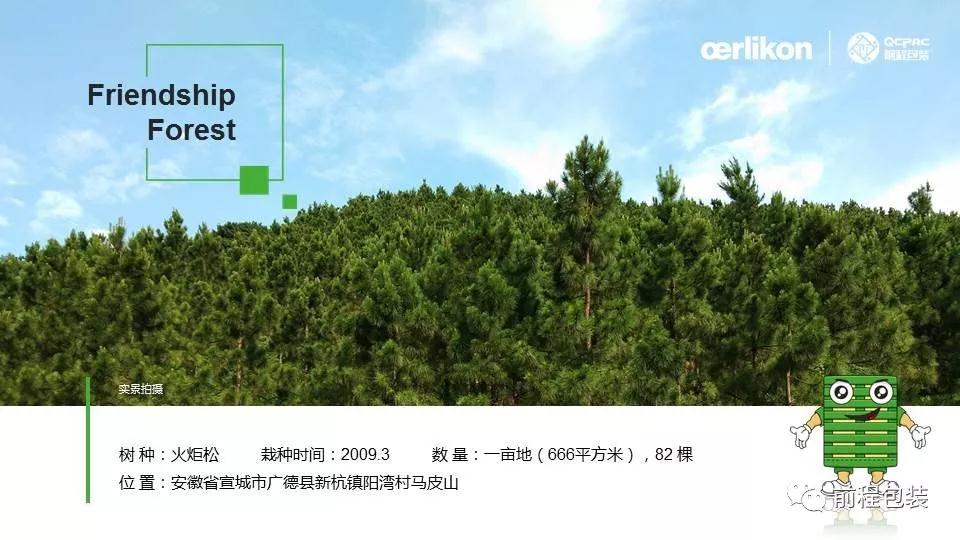 歐瑞康(Wuxi)與前程公司的友誼林位于安徽省廣德市前程東盛生態(tài)林業(yè)有限公司的林場內(nèi),林場現(xiàn)有土地總面積3000多畝,林場內(nèi)有松樹林、竹林、水庫、茶園、山核桃園等;友誼林占地面積為一畝地(666平方米),82棵松樹,品種為火炬松,寓意著雙方的合作擁有更加美好的明天。
