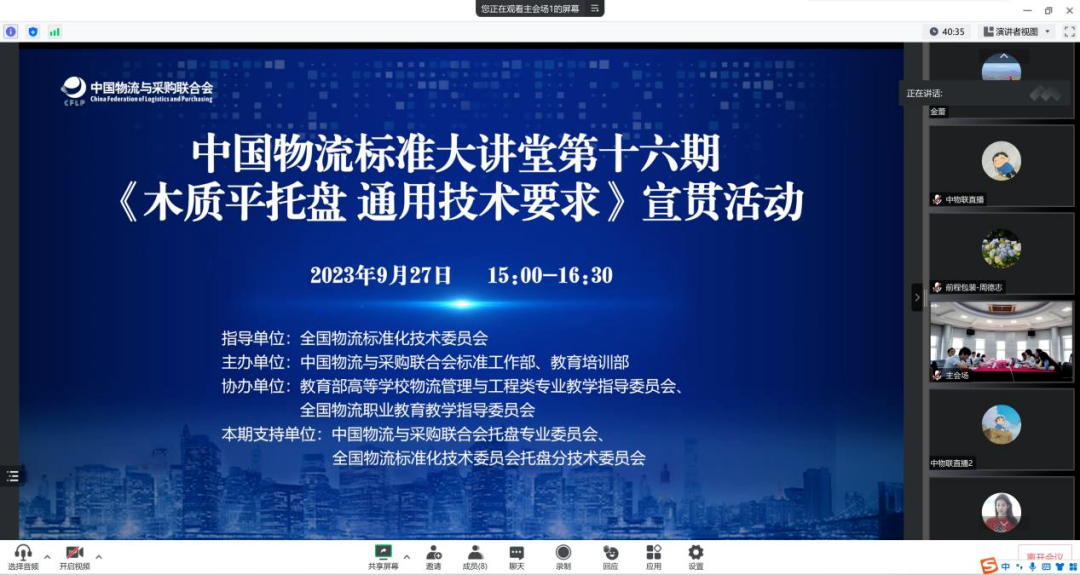 近日 “中國物流標準大講堂第十六期——《木質平托盤 通用技術要求》國家標準宣貫活動”,通過線上線下結合的方式舉辦,專家代表、學者及行業同仁共計2000余人次參加了此次宣貫活動。