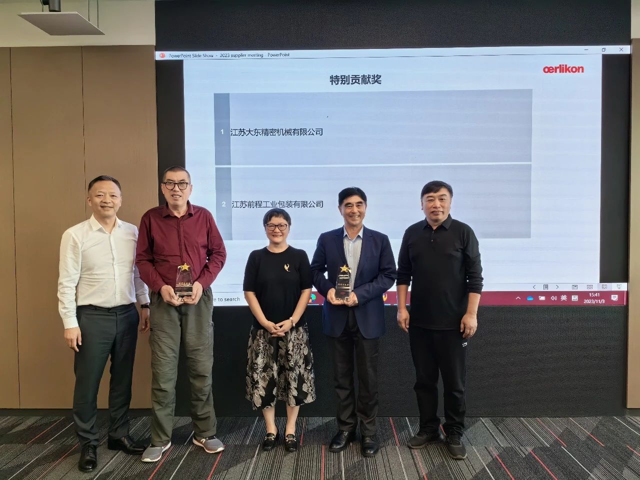 2023年11月3日,在ORK 2023供應商會議上,客戶對前程包裝公司多年來提供高質(zhì)量的產(chǎn)品和卓越的服務支持,尤其在去年疫情期間,攻堅克難,鼎力相助,持續(xù)保障木包裝箱的及時供應充分肯定,給予頒發(fā)“特別貢獻獎”。前程包裝董事長徐平先生出席會議并代表領(lǐng)獎。